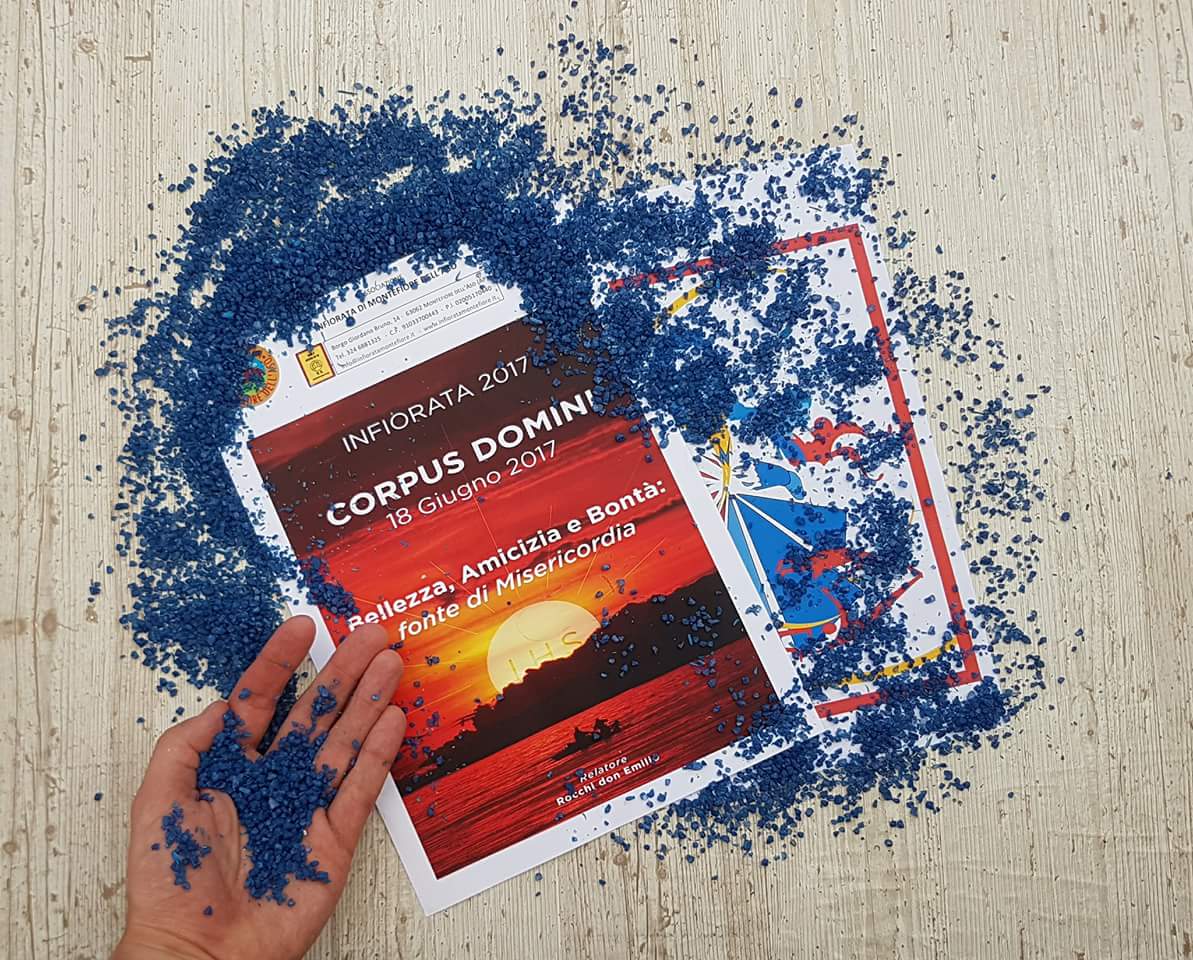 La lunga notte del 17 giugno ha visto invaso da essenze naturali lo scenario dei circa 2000metri del percorso della processione del Corpus Domini 2017, a Montefiore dell’Aso. La XVª edizione dell’Infiorata di Arte effimera è stata centrata sul tema “Bellezza, amicizia e bontà: fonte di Misericordia” e noi, per il secondo anno consecutivo, abbiamo avuto l’onore di essere chiamati a partecipare a questo bellissimo evento! MdSinCoro – nome del nostro Gruppo, in chiaro richiamo al nome della Parrocchia a cui apparteniamo e al servizio che, in comunità, da sempre prestiamo – ha proposto, quest’anno, il bozzetto GESÙ MISERICORDIA, BELLEZZA CHE TUTTO IL MONDO REDIME ispirato al versetto scelto da 2Tm 1,9: “Egli infatti ci ha salvati e ci ha chiamati con una vocazione santa, non in base alle nostre opere, ma secondo il suo progetto e la sua grazia.”